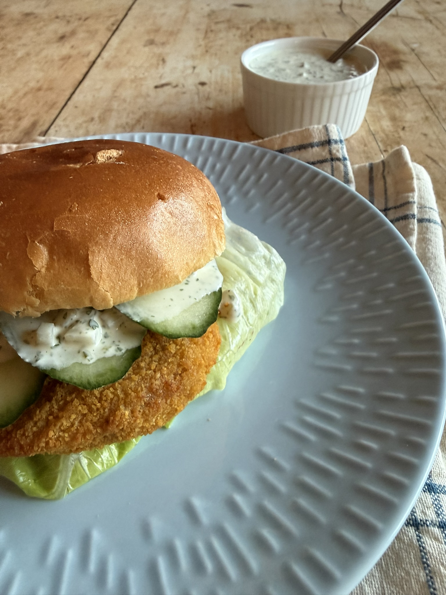 Smyr tatar dressing á botnin, legg hjartasalat, burgara og agurk ímillum, smyr tatardressing á yvirbollan og legg omaná.