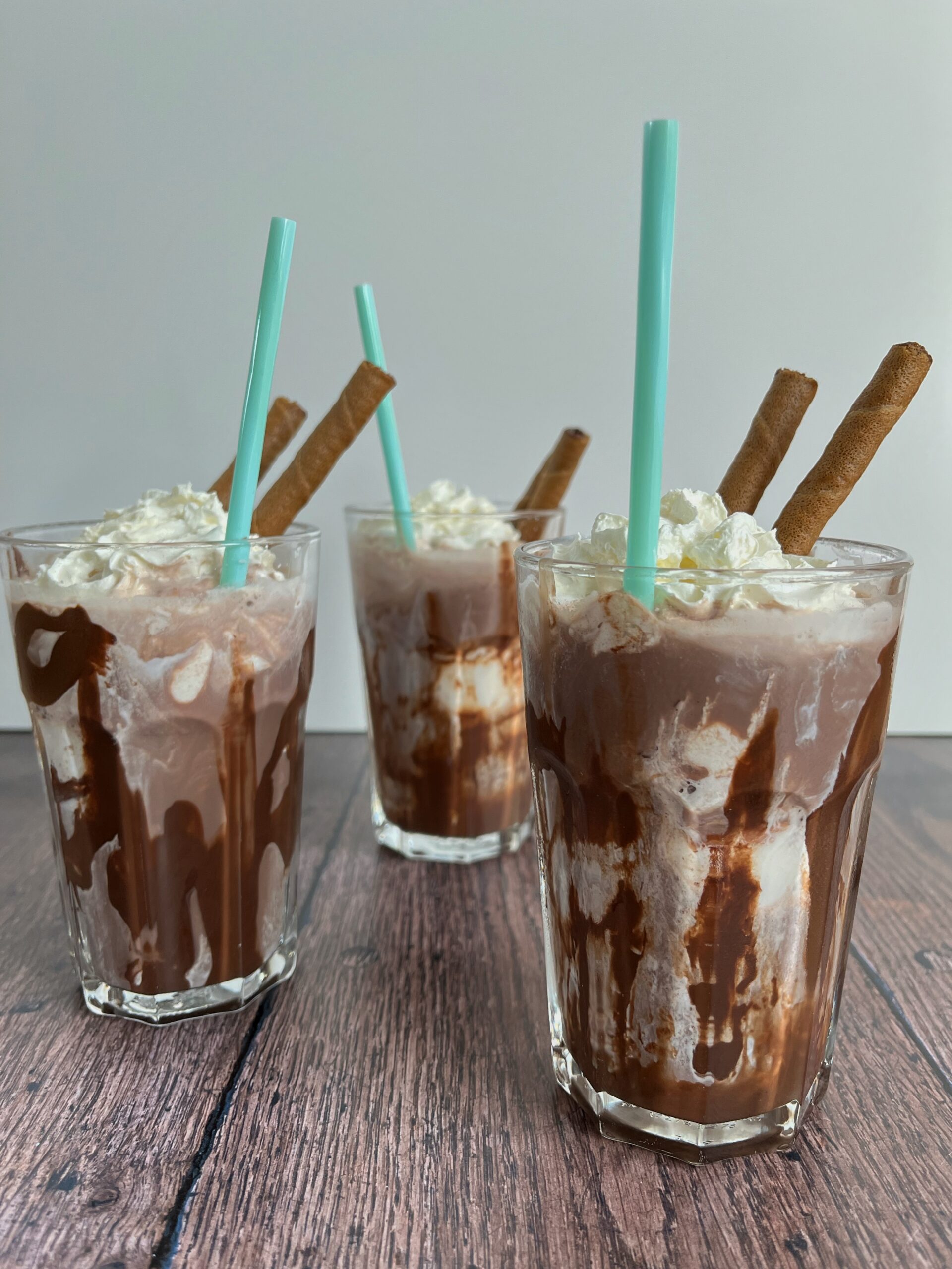 Koyr sjokoláta sós eftir síðunum á glasinum, koyr 3-4 kúlur av vanilju ísi í og fyll restina við kakao.