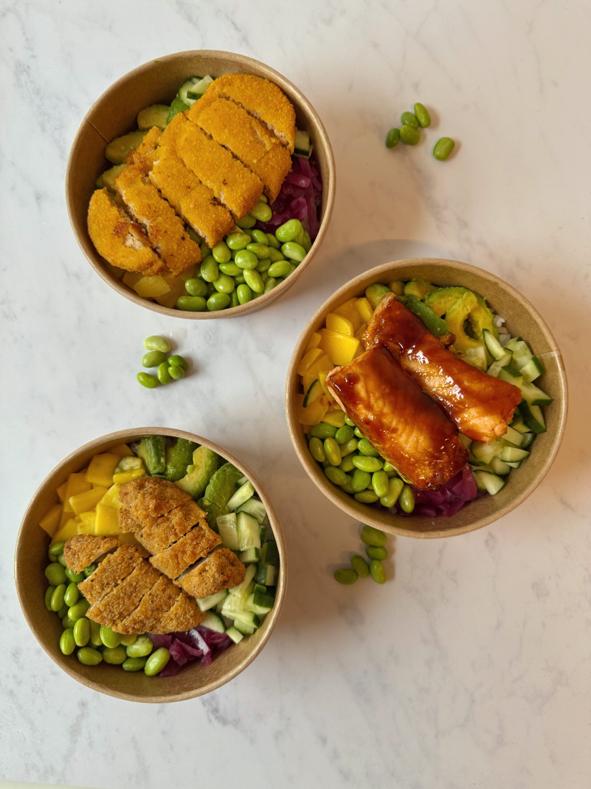 Koyr síðani rís í eina skál, legg avocado, edamame bønir, mango, agurk og súltaðan reyðleyk omaná. Koyr dessing omaná, og til síðst verður proteini lagt omaná.